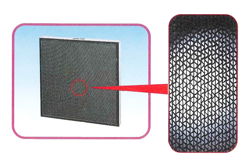 小粒子の高性能活性炭を独自技術により不織布に挟みこんだシートをフィルタ化しました。圧力損失が小さく軽量であるため、クリーンルーム内での使用や天吊空気浄化ユニット等に適しています。
