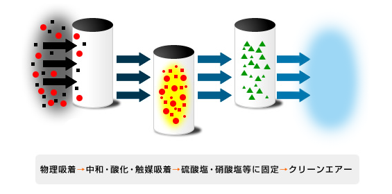 添着させた物質が空気中の成分や有害ガスと化学反応を起こすことで、悪臭成分や有害ガスを除去するという仕組みです。