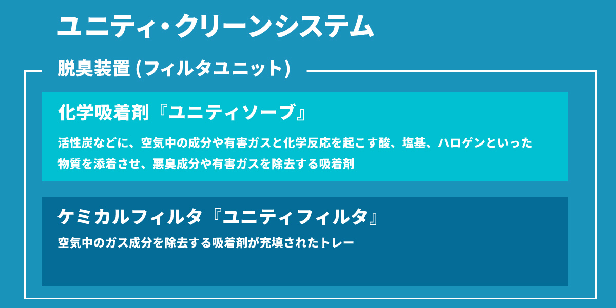 『ユニティ・クリーンシステム』は、分野・場所によって異なるケミカルコンタミネーション(化学汚染)をコントロールし、清浄な環境を維持するシステムです。お客様の設置場所や適応分野にあわせて、ユニティソーブ・ユニティフィルタをご提案いたします。悪臭・有害ガス除去のご要望がございましたら、お気軽にご相談ください。